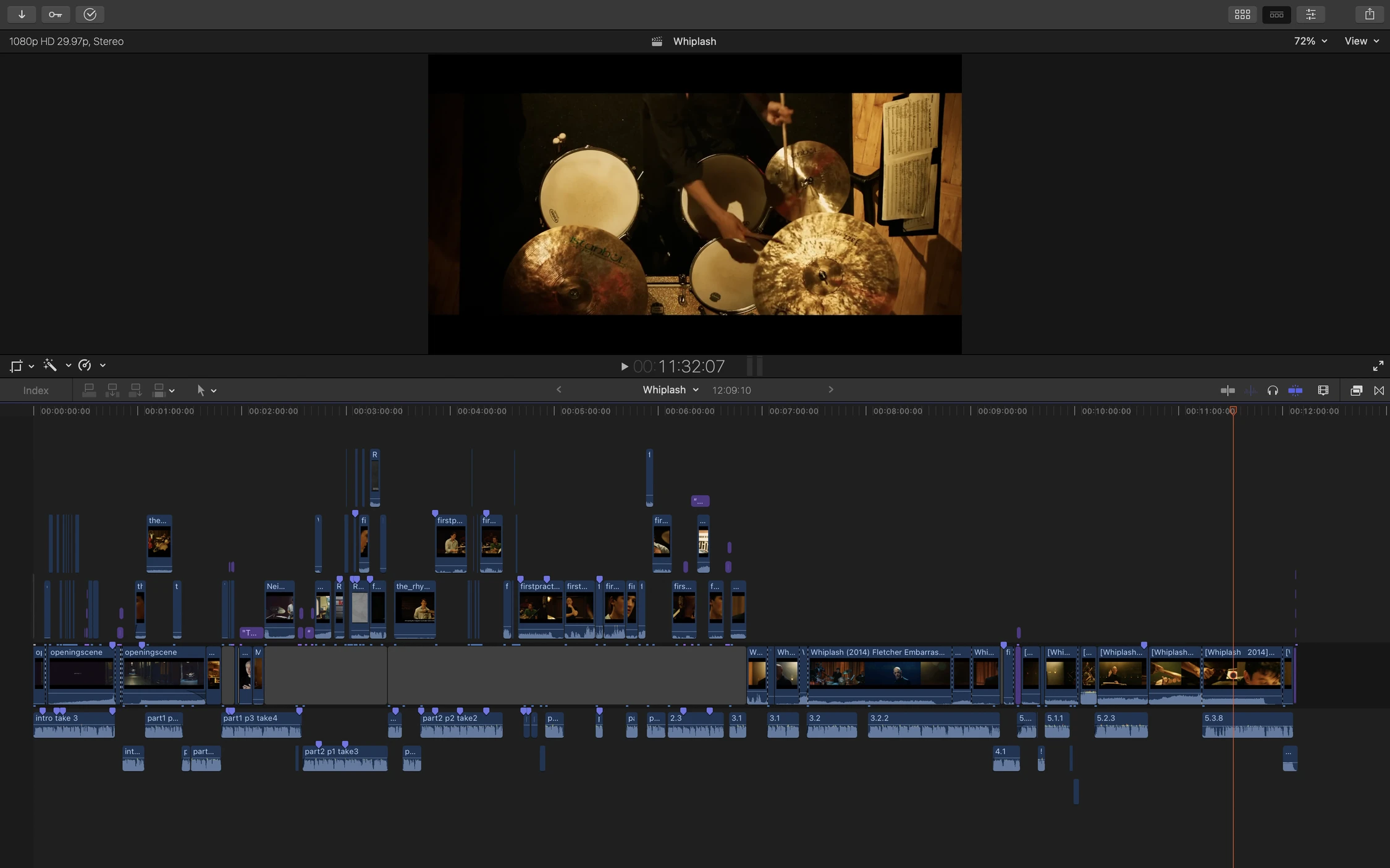 The video analyzes the use of rhythmic cutting, perspective, and subjectivity to create the dynamic style in Whiplash (2014), as well as how this style contributes to the visual storytelling and overall impact of the film. For my editing for film and video course, I was assigned to create a video essay exploring the editing style of a film or film scene. The goal was to create a visually engaging and memorable video showcasing our research and analysis. "The Visual Music of Whiplash" delves into the editing techniques and stylistic choices throughout different scenes of the film and how they contribute to the high energy pace of the film and, ultimately, how they are used to effectively and engagingly tell the story.